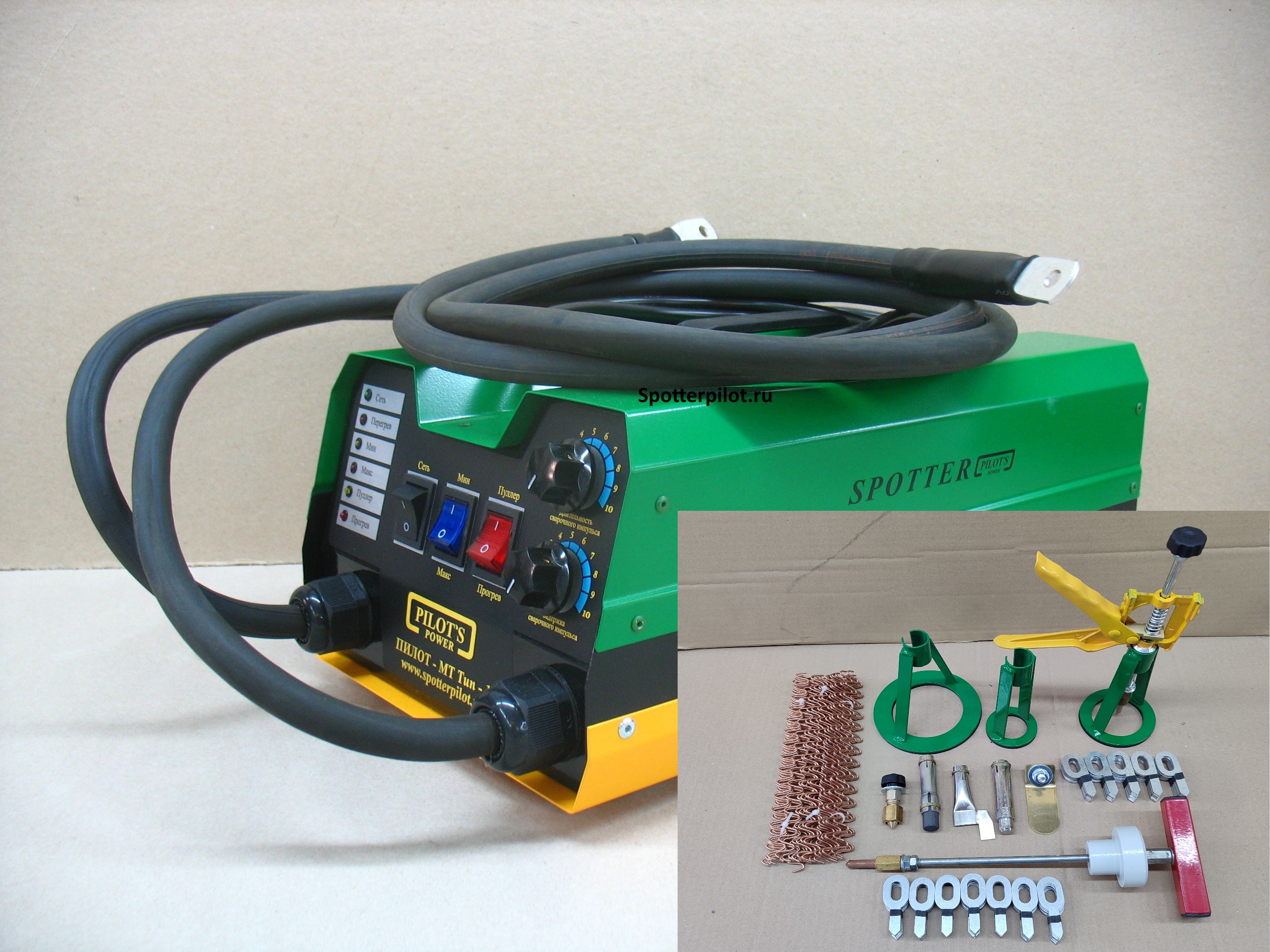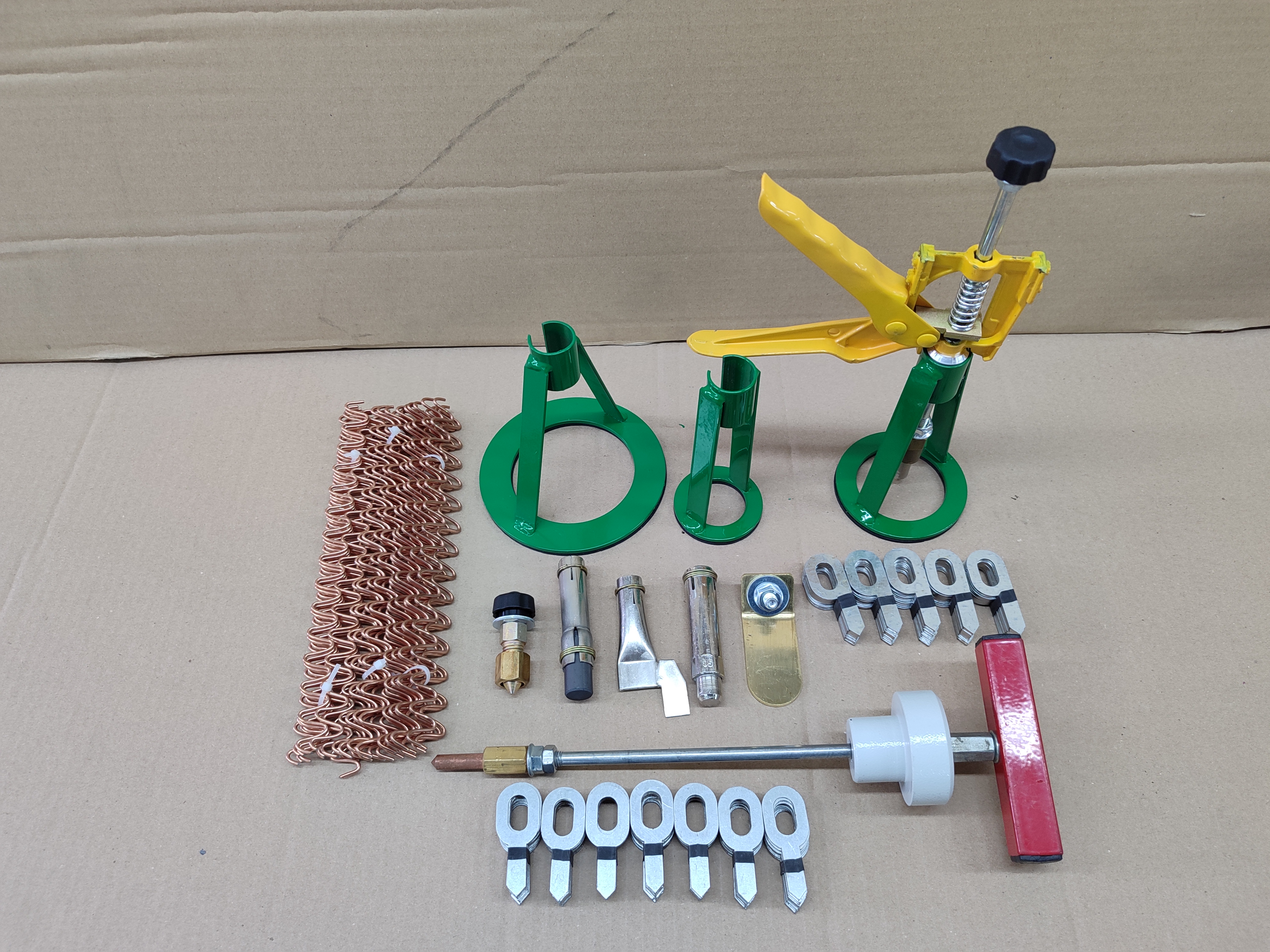 Аппарат, комплект насадок для прогрева и приваривания вытяжных злементов (МФУ), пластина массовая, пуллер с тремя опорами 55мм, 80мм, 120мм, масса приварная, проволока 30шт, вытяжная шайба 70шт, вытяжная шайба со смещенным центром 50шт, обратный молоток 0,5кг.