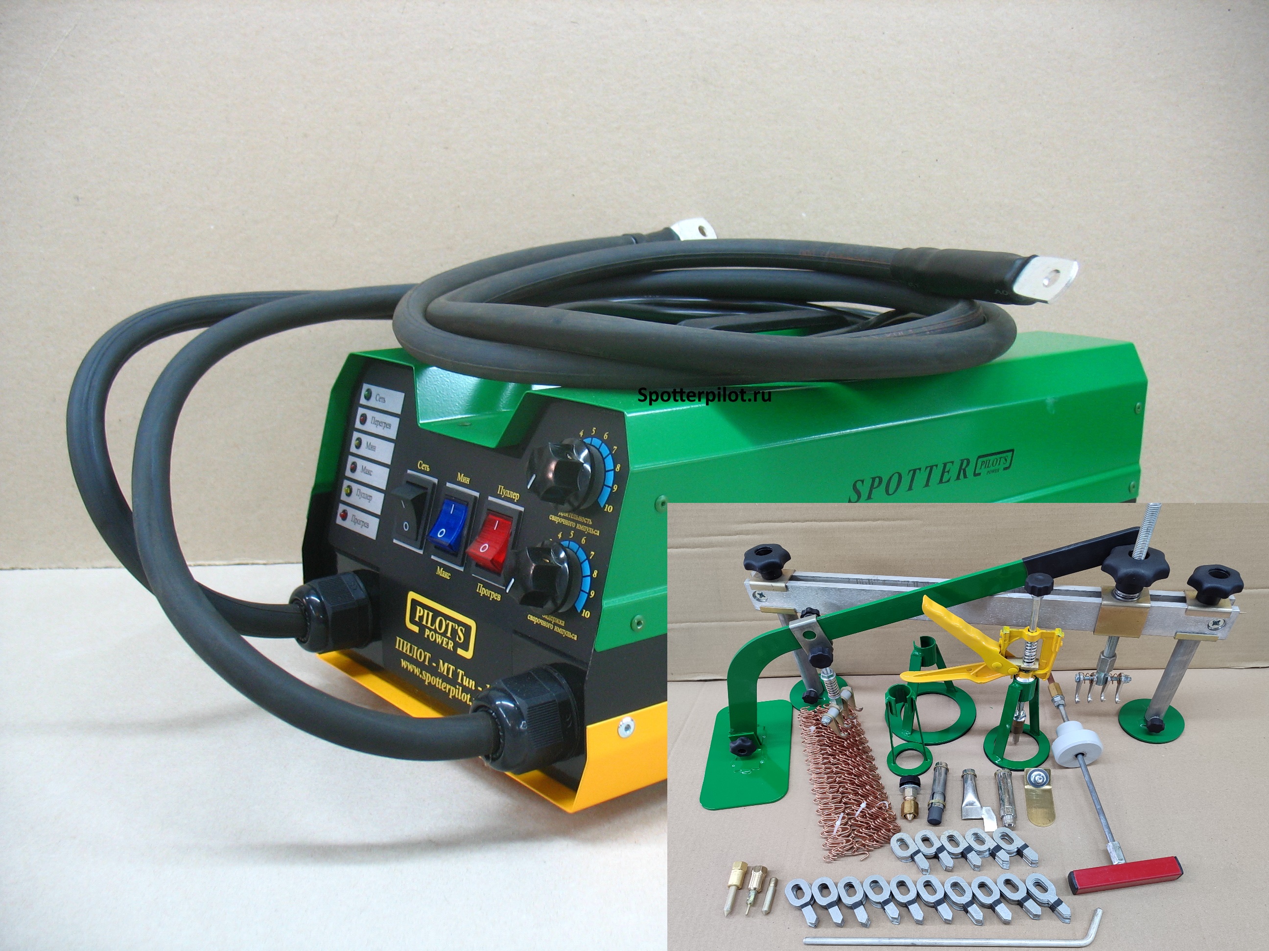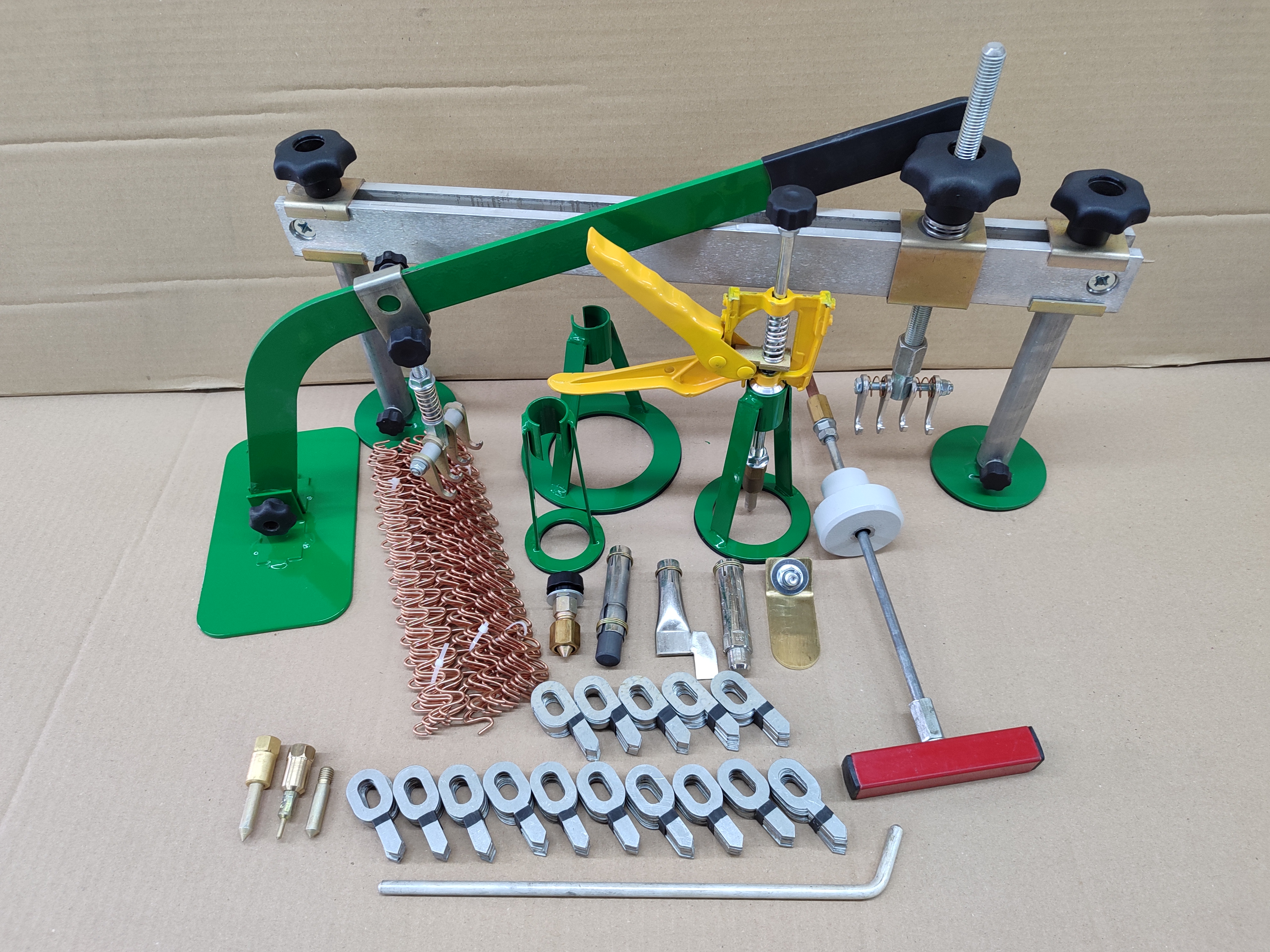 Аппарат, комплект насадок для прогрева и приваривания вытяжных злементов (МФУ), пластина массовая, пуллер с тремя опорами 55мм, 80мм, 120мм, масса приварная, проволока 30шт, вытяжная шайба 100шт, вытяжная шайба со смещенным центром 50шт, обратный молоток 0,5кг, рычаг для вытяжных элементов, траверса 500мм, запасной наконечник электрода 8мм, прварной электрод 3мм, приварной электрод 8мм, шток для вытяжных шайб.