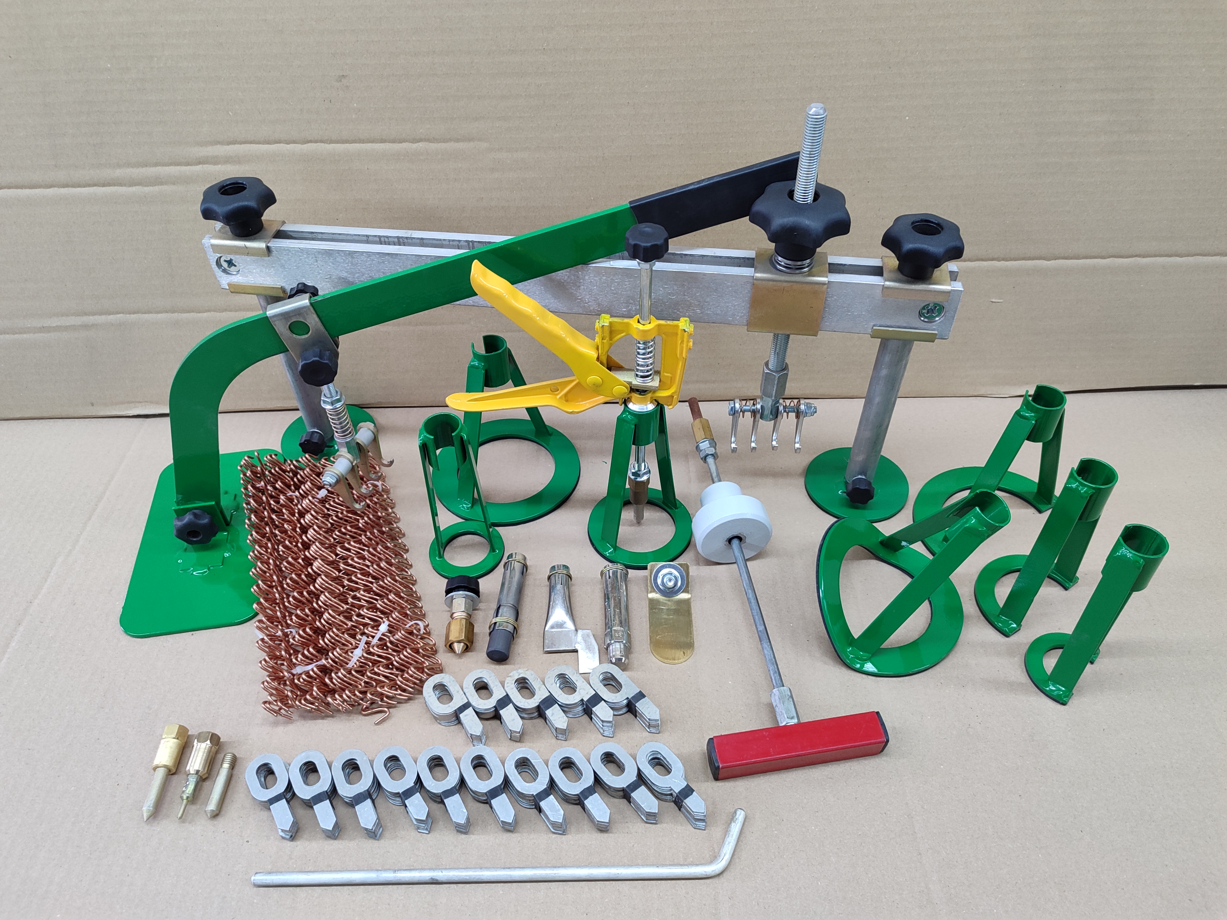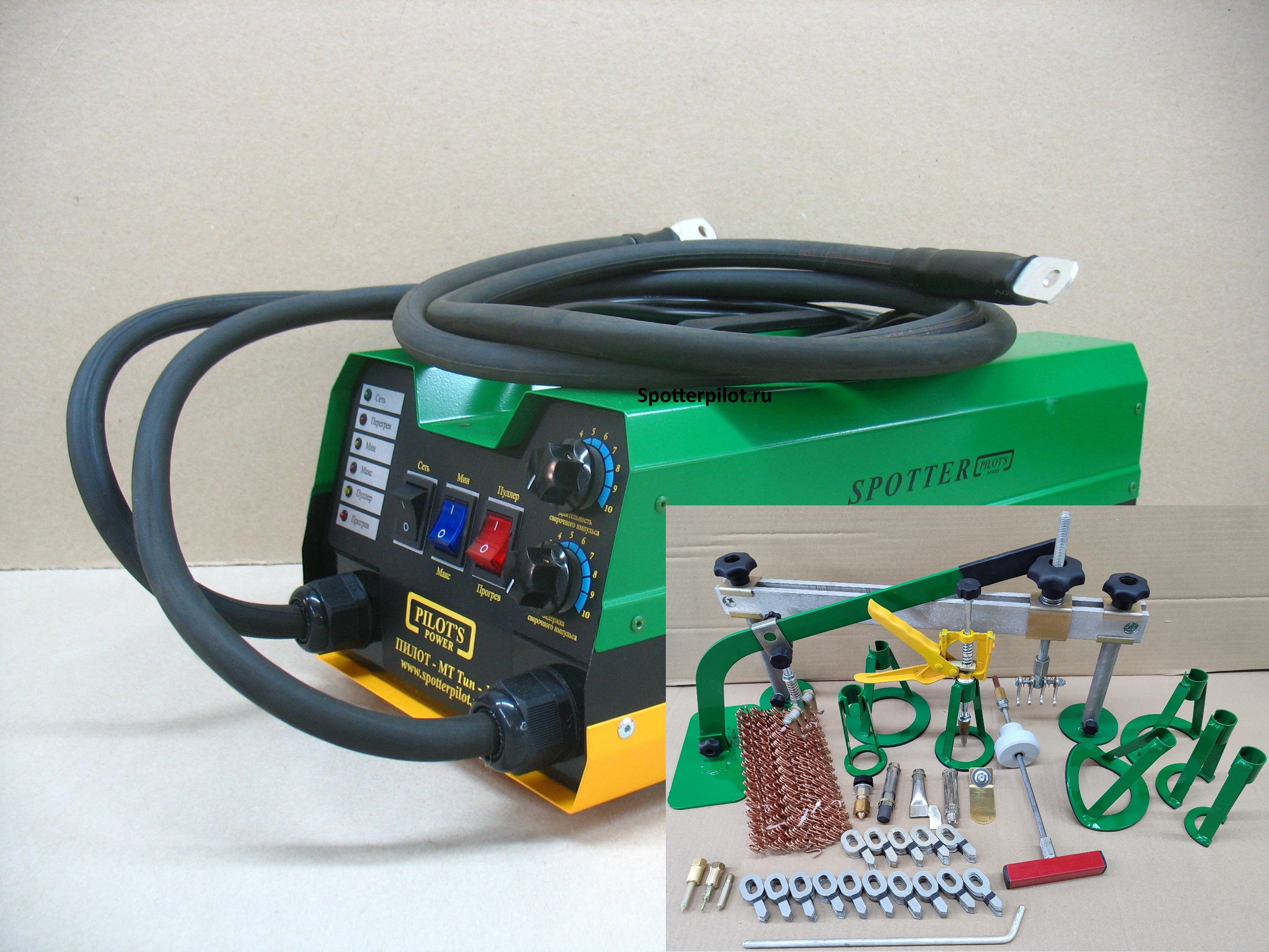 Аппарат, комплект насадок для прогрева и приваривания вытяжных злементов (МФУ), пластина массовая, пуллер с тремя опорами 55мм, 80мм, 120мм, масса приварная, проволока 50шт, вытяжная шайба 100шт, вытяжная шайба со смещенным центром 50шт, обратный молоток 0,5кг, рычаг для вытяжных элементов, траверса 500мм, запасной наконечник электрода 8мм, прварной электрод 3мм, приварной электрод 8мм, шток для вытяжных шайб, опора для вогнутых поверхностей, комплект полуопор 3шт.